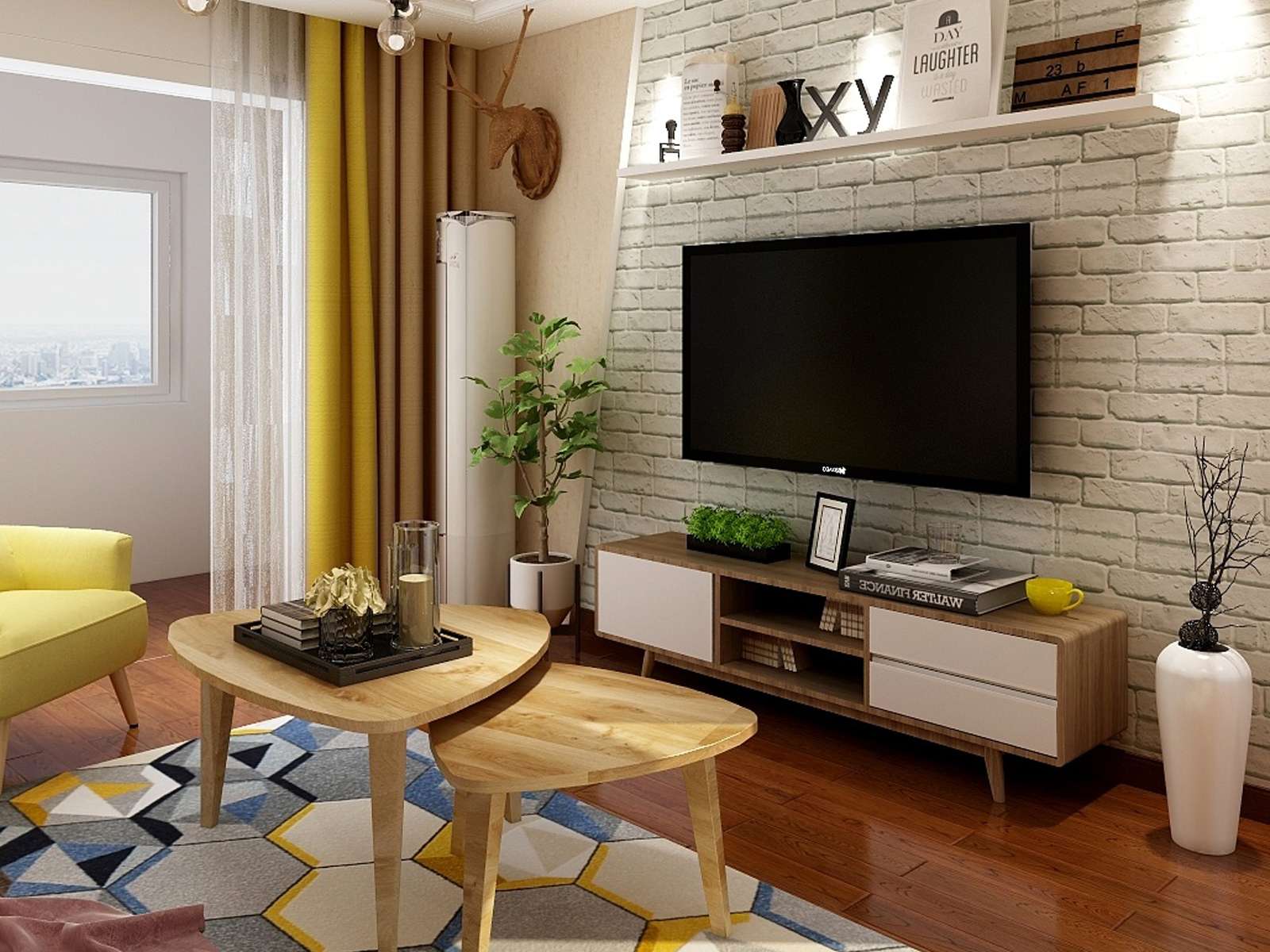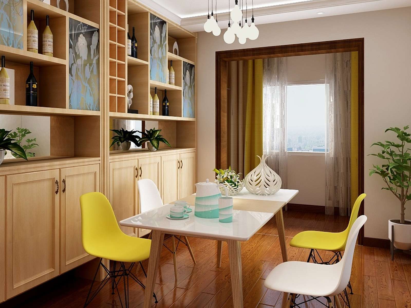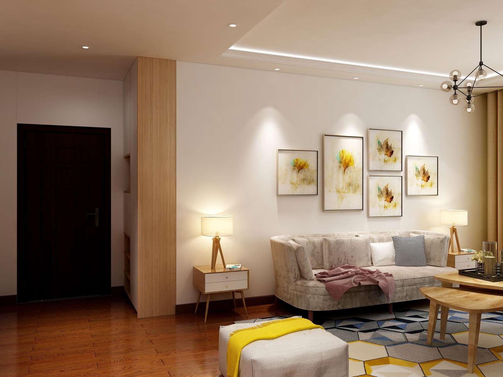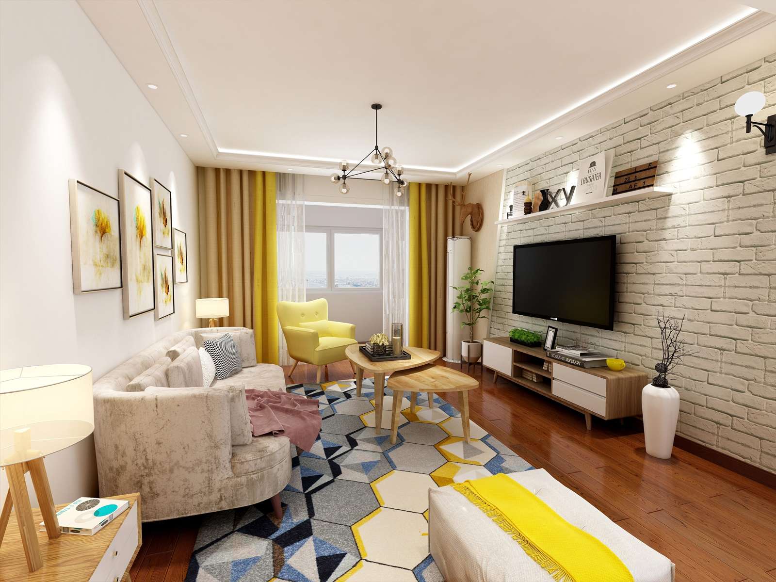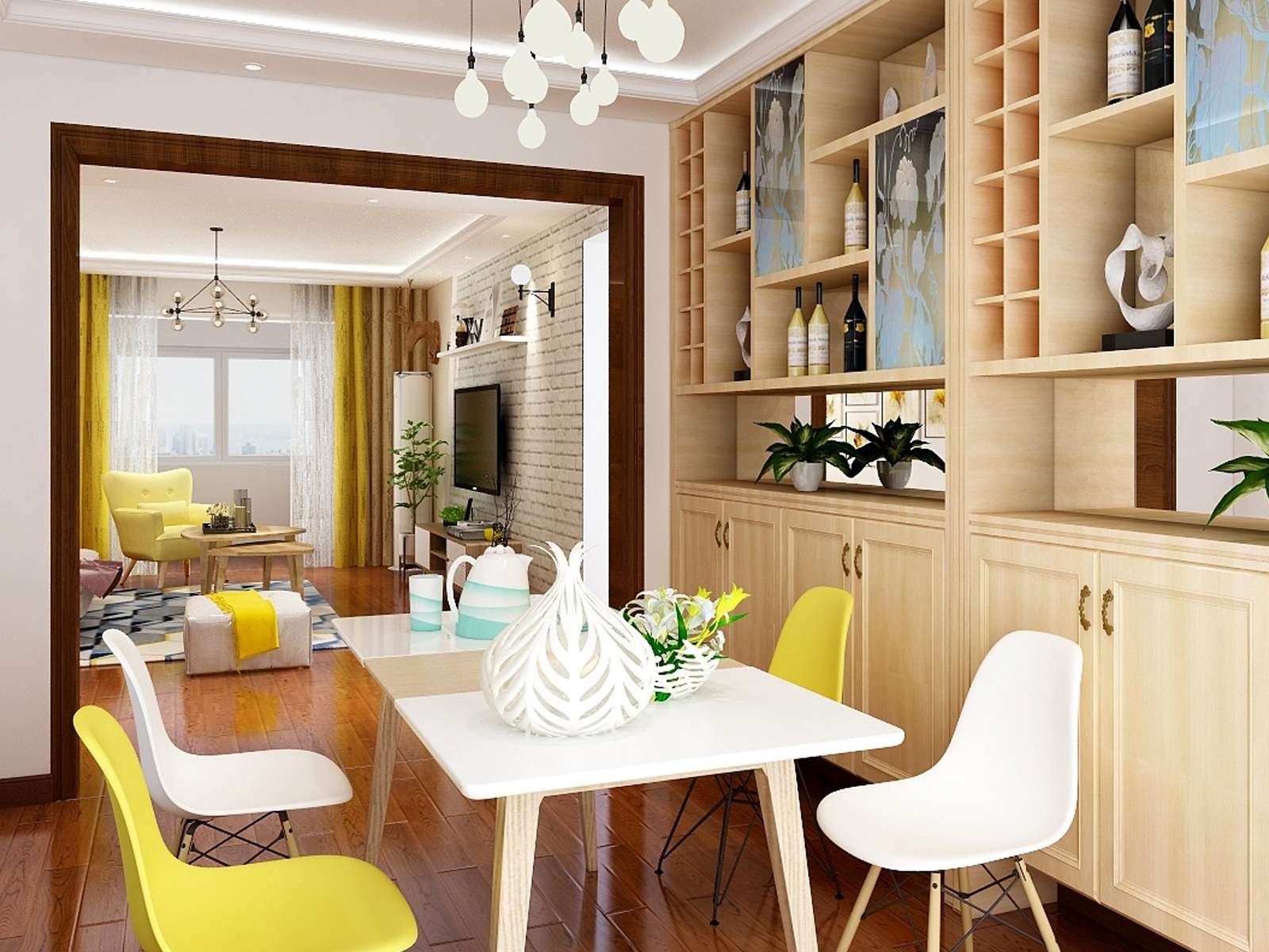 客廳依舊是白加木色的顏色搭配,并適量的添加灰藍(lán)、檸檬黃、咖啡等顏色,讓空間豐富而不花哨。尤其是咖啡加白彷裸磚墻的設(shè)計,拼接自然而特別,充滿了生活的溫馨與樂趣。餐桌和餐椅的顏色選取上,吊燈的造型山,都是經(jīng)典的北歐風(fēng)格。鐵藝與原木相結(jié)合,線條流暢,搭配個性吊燈,給人一種精致優(yōu)雅而又溫馨的感覺。臥室的裝飾設(shè)計更注重的是舒適,每處細(xì)節(jié)都是對生活藝術(shù)的詩意表達(dá)??煽诘鸟R卡龍用色搭配,透漏著不簡單的生活態(tài)度。