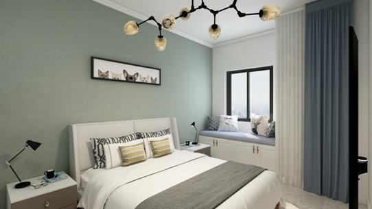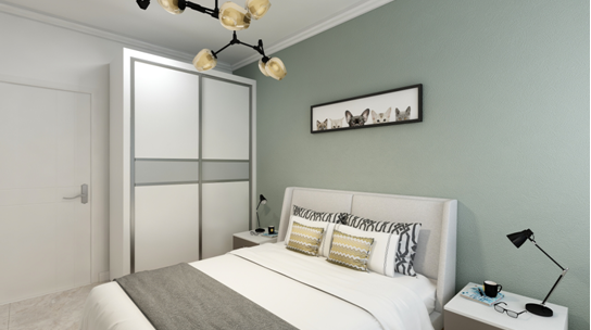 睡床是沿著窗戶擺設(shè),兩邊預(yù)留阿足夠的走動(dòng)空間,床頭背景粉刷灰綠色墻漆,突出床頭背景,與地面地磚顏色相近,看起來(lái)甚是和諧。床品采用淺灰色軟包形式,增加臥室的舒適感,配上深灰色的床品床頭兩邊金屬材質(zhì)的臺(tái)燈凸顯了整個(gè)空間的大氣感,床旁邊有一個(gè)大大衣柜增加了整個(gè)屋子的儲(chǔ)物空間,臥室頂面采用石膏線,從視覺(jué)不會(huì)顯著壓頂.現(xiàn)代住所的開(kāi)展,小家庭的組成,大家心理上的需求,期望臥室具有私密性、蔽光 性,配套洗浴,靜謐舒服,與住所內(nèi)其他房間分隔開(kāi)來(lái)。我規(guī)劃的臥室除了主臥加了個(gè)內(nèi)衛(wèi)外,再者除了擺放雙人床外,留有必定的面積擺放臥室家私,如衣柜,電視柜,床頭柜,還留有必定空間能夠休閑活動(dòng)