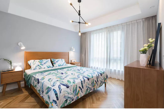 △臥室內(nèi)溫馨原木與清新被單的搭配相得益彰,一盞簡(jiǎn)約個(gè)性的吊燈,像樹(shù)枝一樣,簡(jiǎn)單明了的同時(shí)也有利于房間內(nèi)每個(gè)角度的采光。