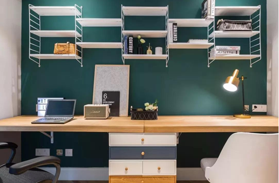 △書(shū)桌其實(shí)是擱板,中間的調(diào)色收納柜將整個(gè)空間分成了兩個(gè)書(shū)桌,墻面上的擱板做成了書(shū)架,整潔又有個(gè)性。