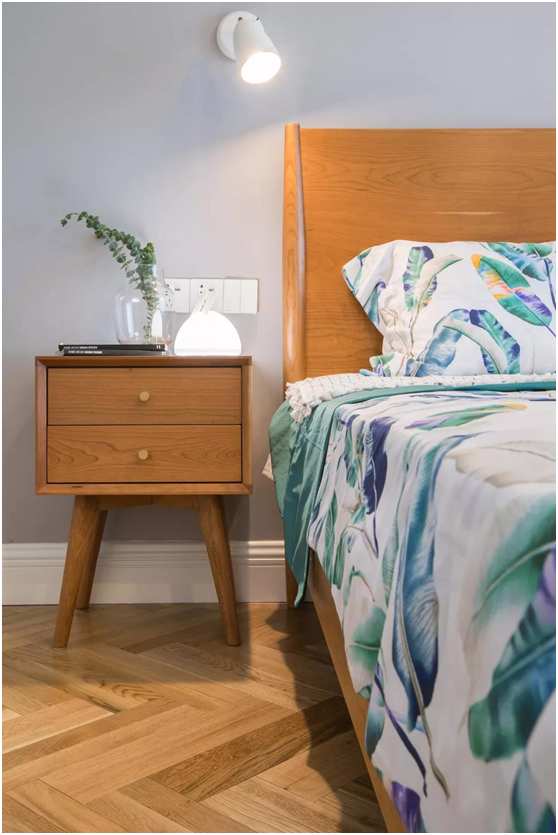 △高腳床頭柜,既有很好的儲(chǔ)物、置物功能,又方便打掃。床頭柜的小燈補(bǔ)充照明,也便于隨時(shí)開(kāi)關(guān)。