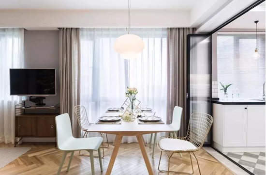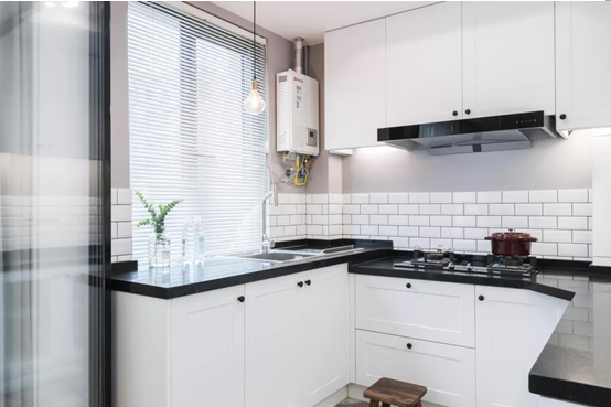 △用折疊式玻璃門將廚房和餐廳隔開(kāi),玻璃門既阻擋了油煙的蔓延,又保證了廚房的采光通透性,有利于做飯時(shí)家人之間的溝通。廚房門旁邊的仙人掌在空間上也起到了一定的隔斷作用。廚房?jī)?nèi)部是U字型的櫥柜布局,白色的柜體、黑色的臺(tái)面、小白磚、灰色墻漆的運(yùn)用,讓廚房層次分明,折疊門的使用也讓廚房平時(shí)更顯寬敞。