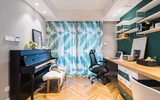 △位于客廳沙發(fā)背后的書(shū)房空間,灰色和青色的墻面形成對(duì)比,把鋼琴和書(shū)桌區(qū)域分開(kāi),墻面的置物架搭配雙人書(shū)桌的設(shè)計(jì),滿足了書(shū)房的收納需求