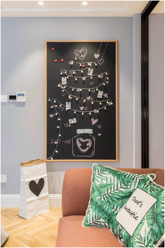 △書(shū)房和客廳之間的墻面還掛了一個(gè)小黑板,可以用來(lái)記錄屋主一家的點(diǎn)點(diǎn)滴滴,小串燈的“之”字形像是棵圣誕樹(shù),讓這個(gè)地方多出了文藝小清新的感覺(jué)。