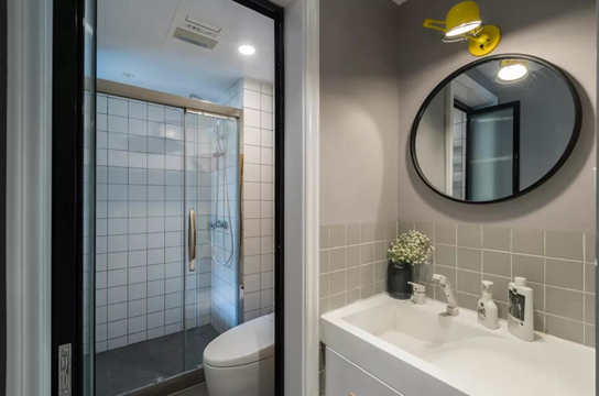 △衛(wèi)生間做了干濕分離,把洗手臺(tái)外移到衛(wèi)生間門外。地面和墻面還是主色調(diào)低調(diào)的淺灰色。馬桶和淋浴區(qū)之間也做了隔斷,再也不用擔(dān)心水汽的煩惱。圓形鏡子上有一個(gè)黃色的小臂燈,用來(lái)補(bǔ)充照明。△純白色的洗手臺(tái)和墻面的淺灰色小磚形成對(duì)比,臺(tái)面上放置了一個(gè)小花瓶,作為裝飾。
