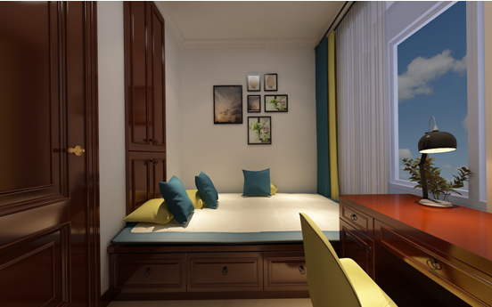 2:主臥室的墻面顏色以白色為主和家具深顏色形成互補(bǔ)反差,由于空間不算小,在考慮多個(gè)方案后,感覺(jué)還是把衣柜放到了床對(duì)面的那面墻,這樣的話不僅空間布局合理,而且滿足的功能更多,能增加更多的儲(chǔ)物空間,原有飄窗去掉做成休閑與儲(chǔ)物一體的儲(chǔ)藏。
