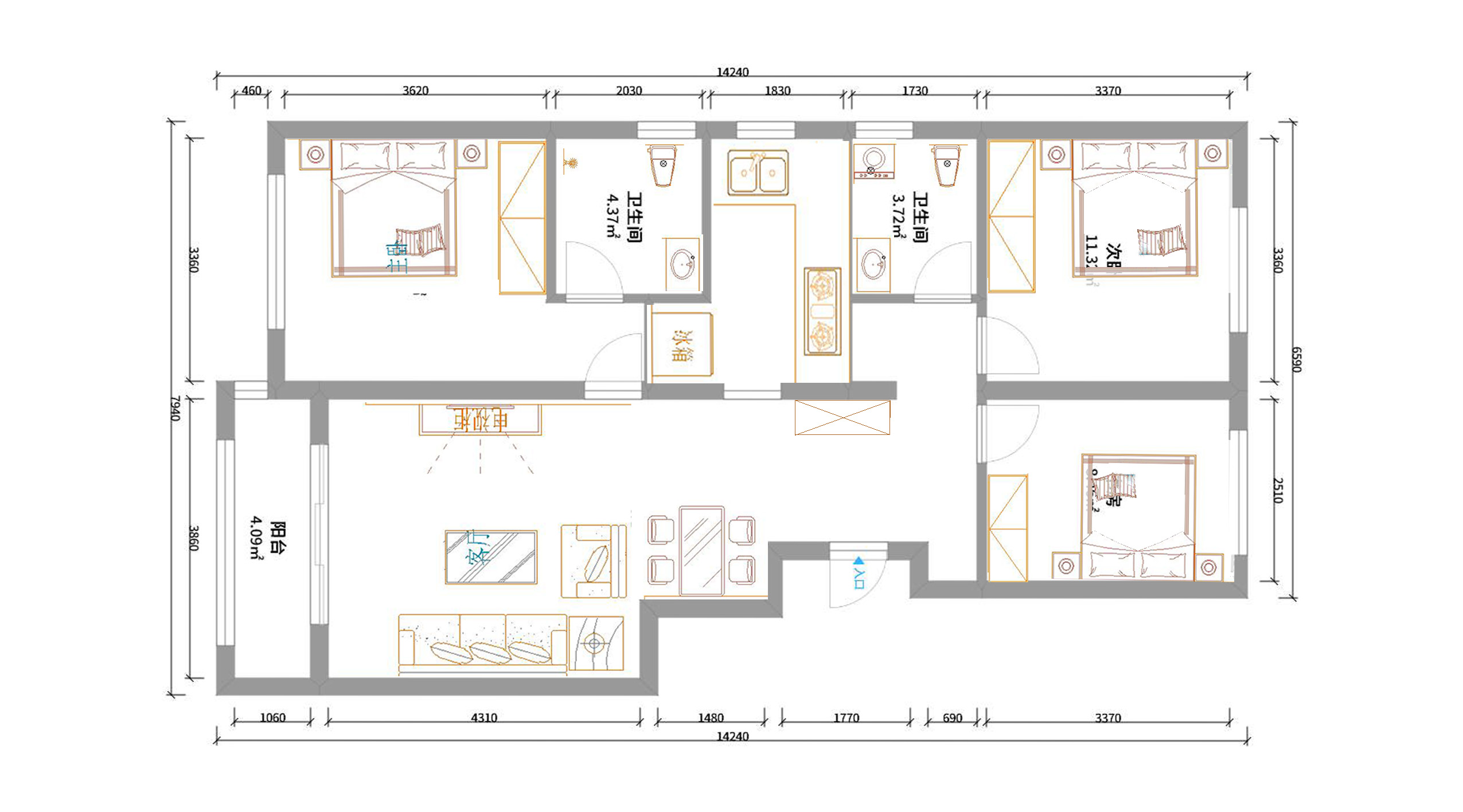 平面布置圖分析:進(jìn)門右手邊是一個(gè)鞋柜起到很好的收納作用,餐廳和客廳區(qū)域分離開來,廚房是一字形,把冰箱放到廚房里生活更便捷一些,主臥室放正常尺寸的雙人床和大衣柜保證充足的儲(chǔ)物空間,次臥室是女兒房想要個(gè)梳妝臺。
