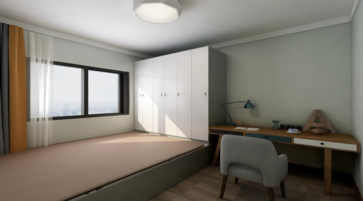 北書(shū)房做了一個(gè)東西方向通長(zhǎng)的榻榻米,衣柜和書(shū)桌在一條線上,整潔、方便、實(shí)用,北面兩個(gè)臥室的色系都做了調(diào)整,換成了冷色系,配上深色的木地板,是房間不會(huì)顯的太冷,而又富有質(zhì)感。由于榻榻米衣柜的限制,書(shū)房的窗簾只能選擇單窗簾向開(kāi)啟。