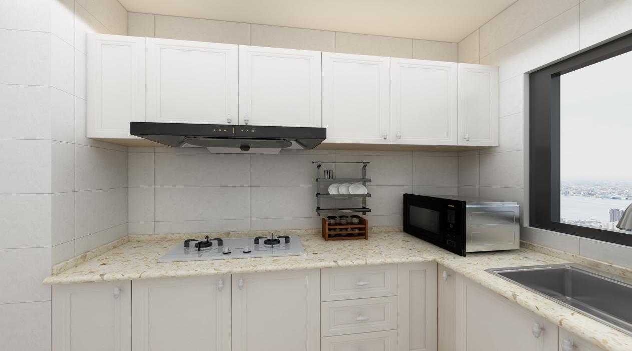 整體櫥柜實(shí)用為主,地面、墻面與頂面都以淺色調(diào)為主,搭配上淺櫥柜門(mén)板,顯得干凈整潔。水盆、操作臺(tái)和灶臺(tái)保證了洗切炒的順序,方便我們?nèi)粘J褂茫?/span>L形地柜+一字形吊柜,最大限度的增加了廚房的儲(chǔ)物空間。