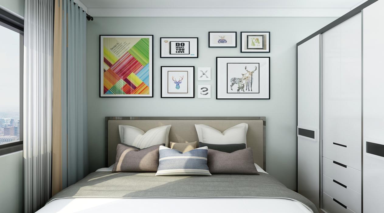 對(duì)于主臥室,配以了和客廳一樣的色系,配上一個(gè)現(xiàn)代風(fēng)格的1.8米大雙人床,一組簡(jiǎn)約的床頭裝飾畫(huà),一定能給業(yè)主一個(gè)非常放松的休息的環(huán)境。而北側(cè)的通頂衣柜,大大的滿足了我們?nèi)粘5膬?chǔ)物需求。最搶眼的就是南側(cè)的大飄窗,讀書(shū)、品茶、曬太陽(yáng)、觀風(fēng)景,都是美好的享受。