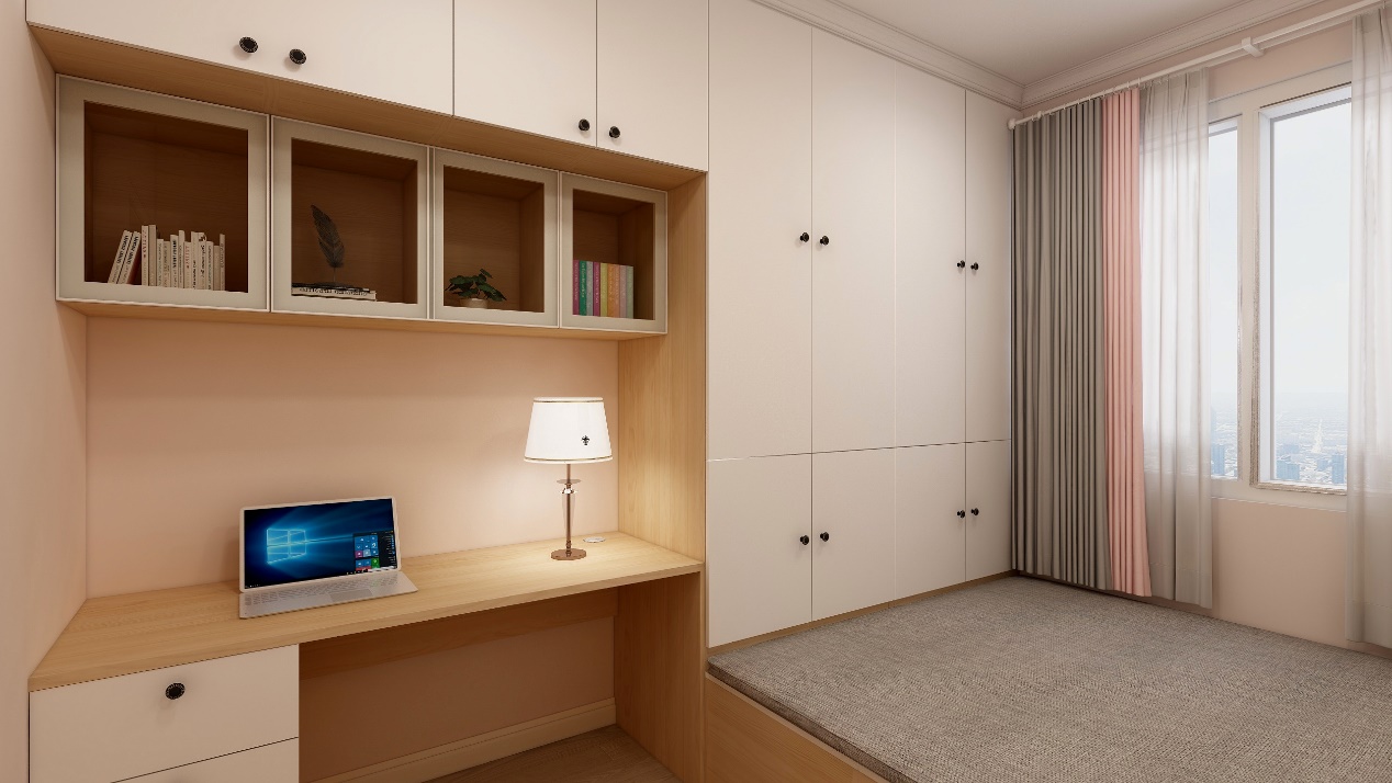 因為考慮到儲物空間及常住人口數(shù)量,考慮次臥室做了個榻榻米,榻榻米打破了垂直空間收納的慣例,內(nèi)部柜子在水平地面也能發(fā)揮超強的儲物能力,是提升空間利用率的先行者。這樣既增加了整體的儲物空間又兼具寫字臺及書柜的空間。顏色上考慮用原木色和白色這兩種經(jīng)典顏色做搭配,墻面搭配上孩子喜歡粉色。