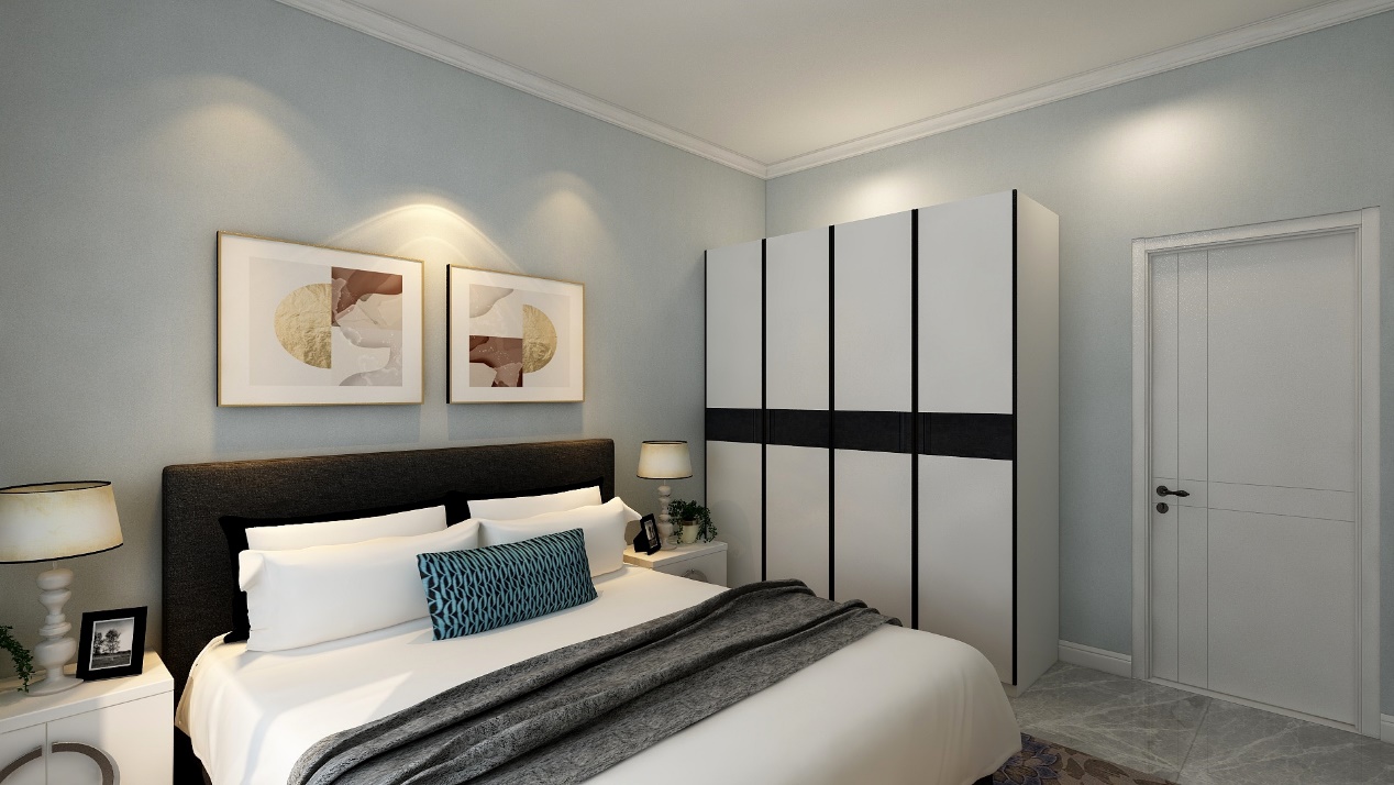 在臥室的設(shè)計上,要追求的是功能與形式的完美統(tǒng)一,優(yōu)雅獨特,簡潔明快的設(shè)計風格。頂部是白色墻漆,墻面上是和客廳統(tǒng)一的淡藍色的墻漆,淺色的家具上深色的裝飾線條,使得整體設(shè)計簡單又帶有活力。在臥室設(shè)計的審美上,追求時尚而不浮躁,莊重典雅而不乏輕松浪漫的感覺。因此,在臥室的設(shè)計上,會更多的運用豐富的表現(xiàn)手法,使臥室看似簡單,實則韻味無窮