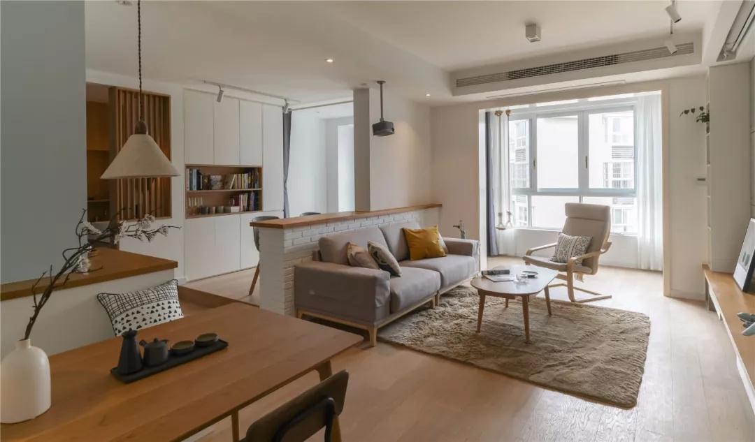 客廳與書(shū)房打通并以矮墻吧臺(tái)隔開(kāi),帶給了客餐廳額外的采光,原本短促的視野也幾乎增長(zhǎng)了一倍,顯得寬敞了許多。