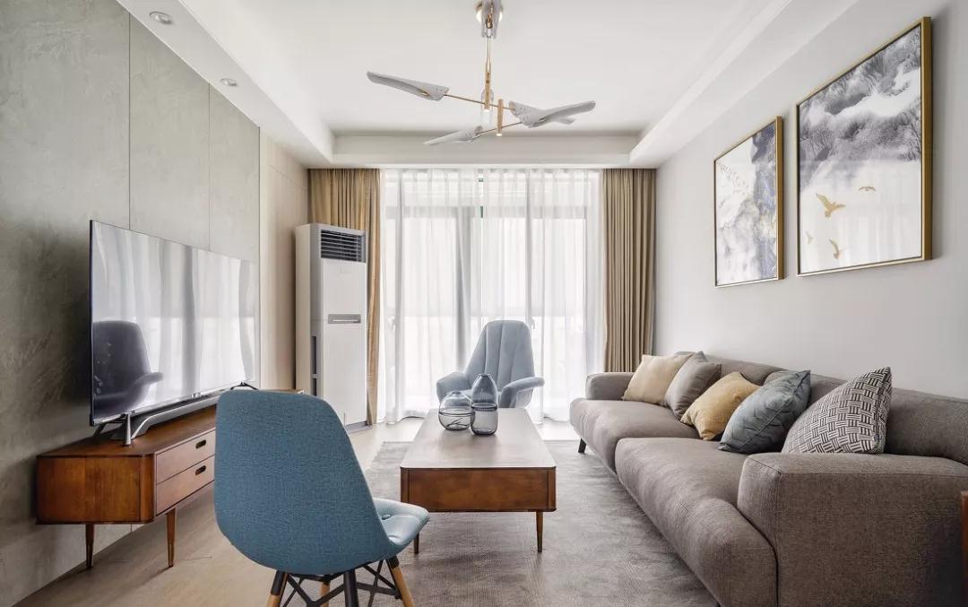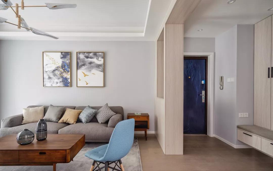 利用一深一淺的藍(lán)色,這組相色系作為整體的配角色,打破灰色沙發(fā)帶來的沉悶感。