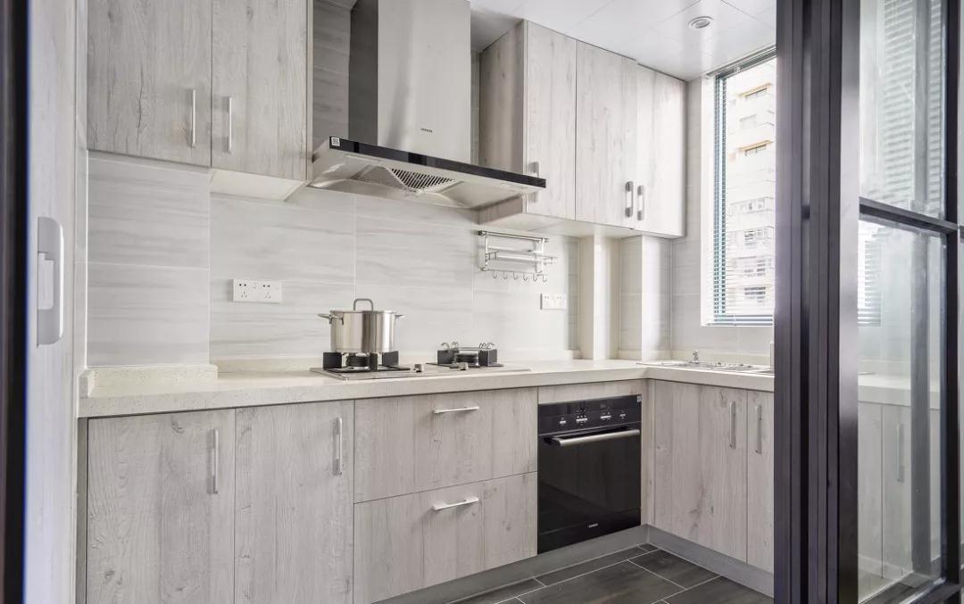 黑白灰+木色的經(jīng)典組合,運用于不同的材質(zhì)上,板材、瓷磚、不銹鋼、石英石,形成了簡潔的廚房空間。